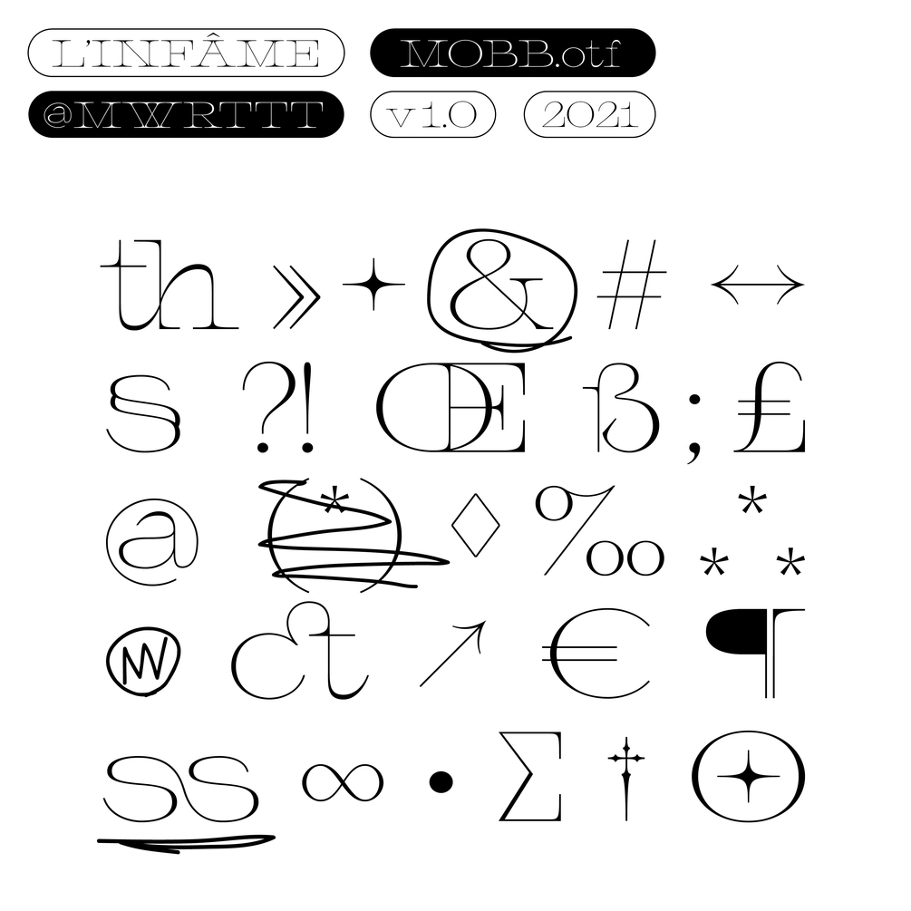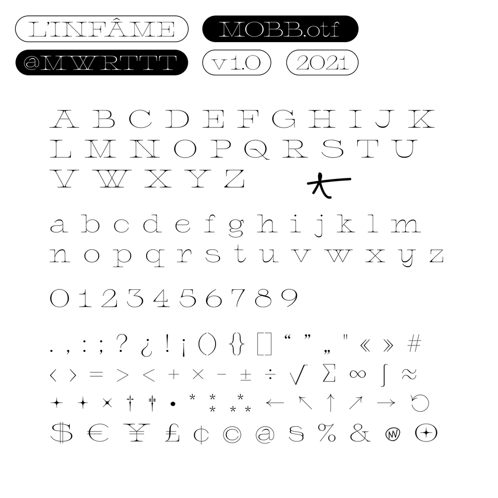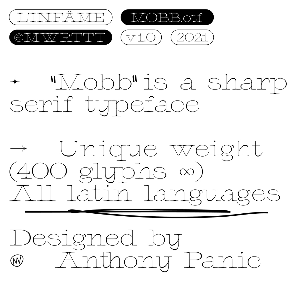 Mobb is a typeface which presents an interaction between thin lines and dangerous serifs. Its large sharp design is contrasted by sinuous curves along 400 glyphs. Mobb can be used as a display typeface as well as for small texts. Mobb refers to the (in)famous Mobb Deep and their well constructed, elegant, sensitive but at the same time violent lyrics.
